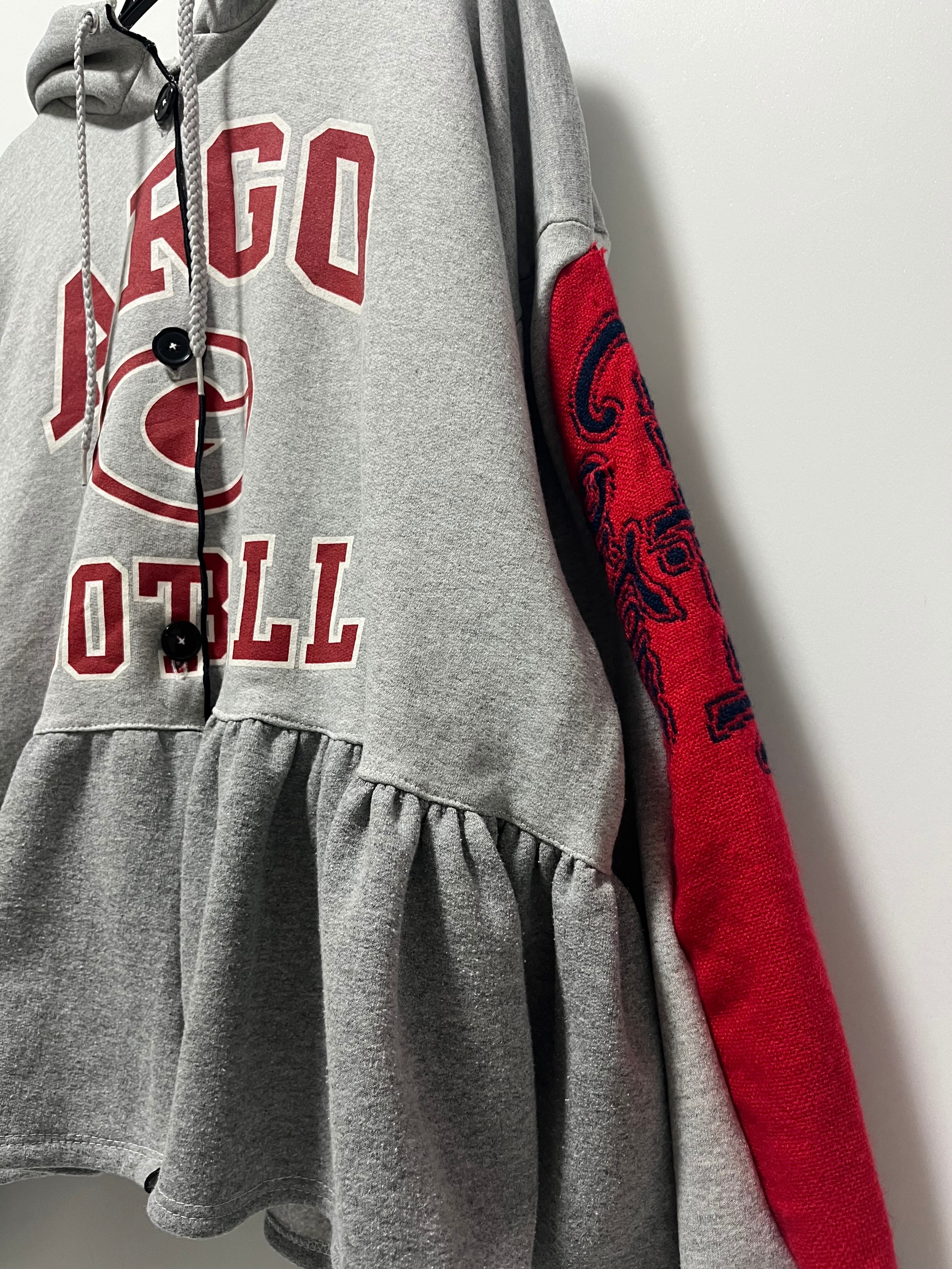 パーカーのスエットにボタンをつけてカーディガン風に仕上げたこの一着は、袖に暖かいマフラーをドッキングさせ、フリルが動きのあるデザインを演出しています。春先まで着用できるアイテムとして、カジュアルな印象の中に華やかさをプラスしました!日常のコーディネートや特別なお出かけにも最適です。暖かさとおしゃれを両立させた一品をぜひお試しください。