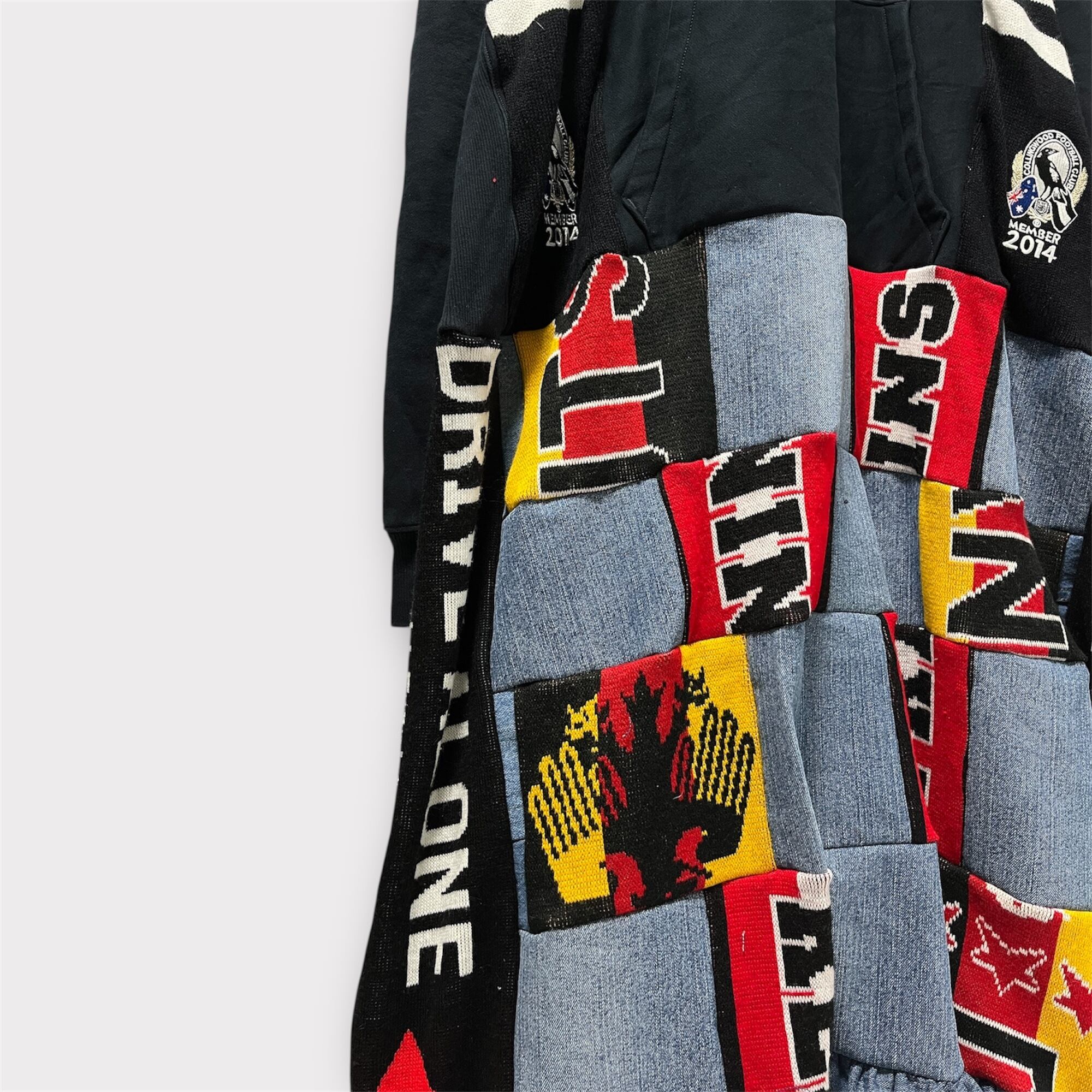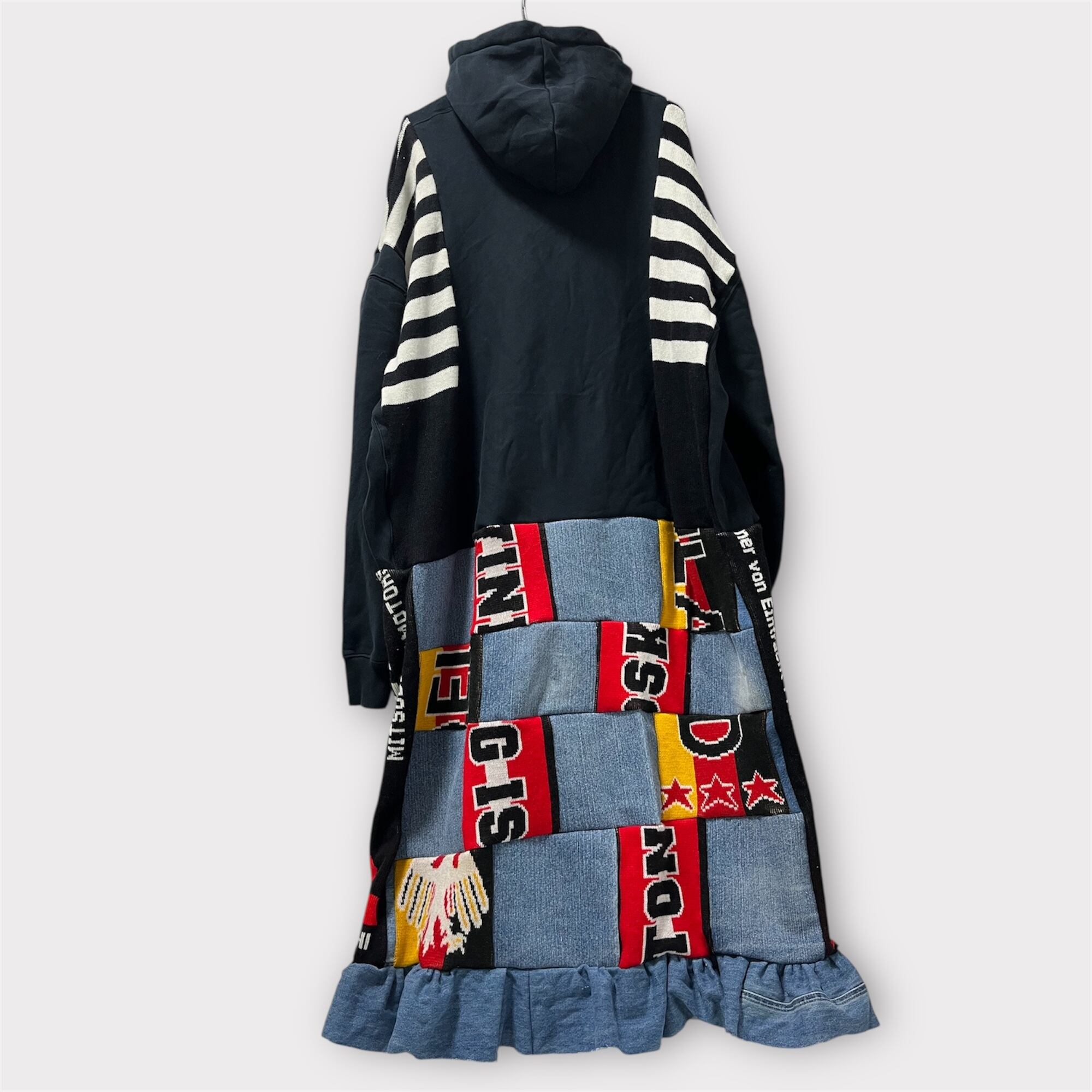 広がるシルエットが魅力!「BIGマフラーブロックフリルワンピース」が新登場です!再リメイク商品ならではのユニークなデザインが特徴で、ボーダーラインを縦や横に切り替えたブロックデザインが目を引きます。サイドにはスポーツマフラーをあしらい、個性的な仕上がりとなっています。ボリューム感を加えたフリルが、動くたびに華やかさを演出し、あなたのスタイルを一層引き立てます。カジュアルな日常使いから特別なお出かけまで、どんなシーンにもマッチする一着です!この機会にぜひ手に入れて、自分だけのスタイルを楽しんでください!