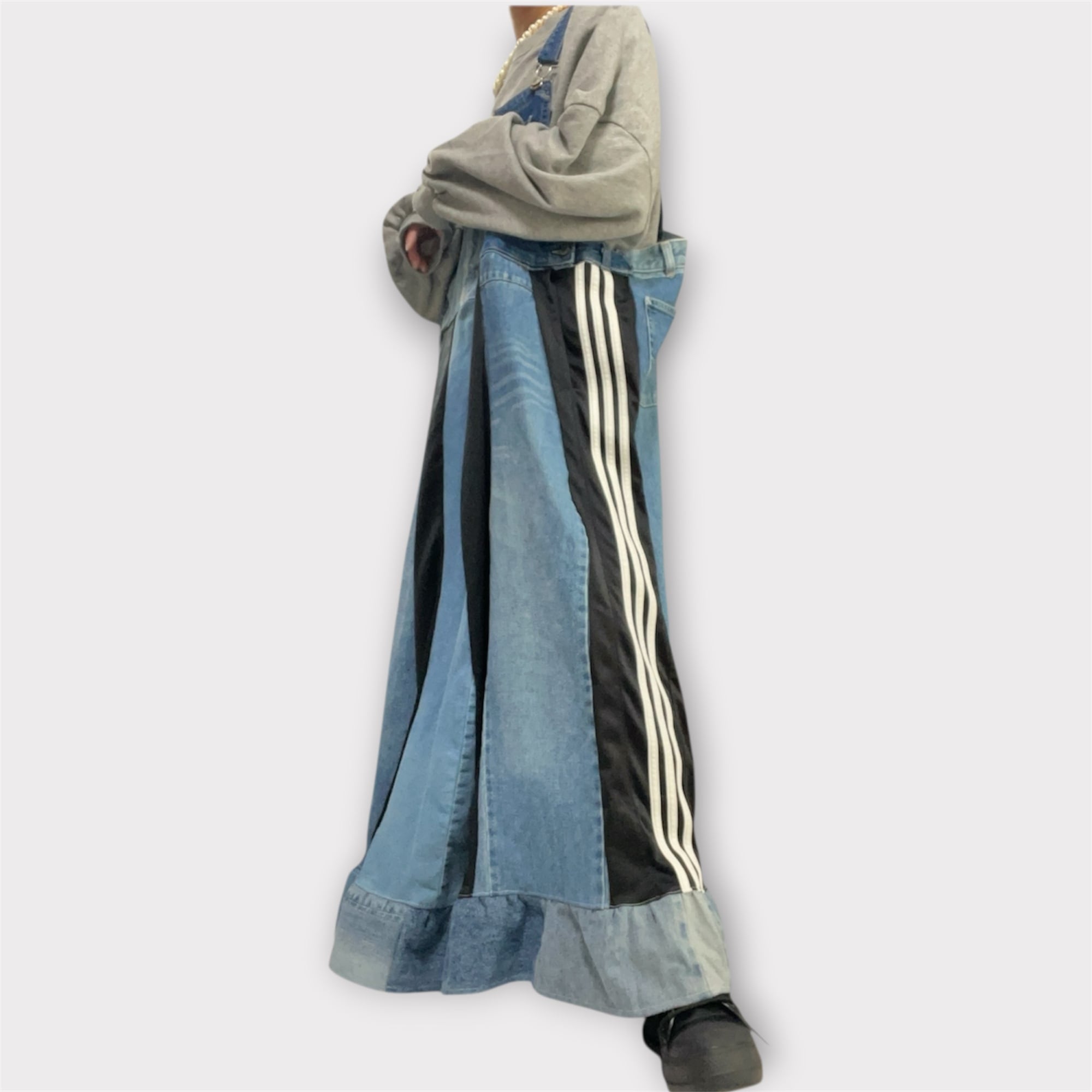 春夏秋冬、どのシーズンでも活躍する「オーバーオールワンピース①」です!デニムとジャージをドッキングしたユニークなデザインで、幅広いシルエットが魅力ポイント。ゆったりとした着心地で、リラックスしたい日にもぴったりなアイテムです。このオーバーオールワンピースをコーディネートに取り入れて、カジュアルでスタイリッシュな印象を楽しんでください! □Size(平置き)